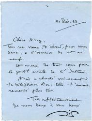 RIP (Georges Gabriel Thenon, dit)Lettre autographe signée. 31 décembre 1933 ; 1 page in-8°. « Chère Meg, Tous nos vux, d'abord, pour vous deux, à l'occasion de cet an neuf. Et merci de tout mon cur pour le gentil article de L'Intran. »