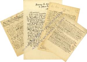 BLOY Léon4 pièces autographes (minutes ou brouillons de lettres) adressées à René Martineau. [1910-1915]; 5 pages 1/2 in-8° ou in-12 avec ratures et corrections.— « Je vous informe que notre ami March. succombe. L’angoisse de ces derniers jours ne peut plus être supportée. » Il lui offre son livre [L’Âme de Napoléon]. « Voici en vous embrassant de tout coeur, l’humble cadeau du Mendiant à son ami R.M. pour le nouvel an. Puisse cette dédicace d’un écrivain horriblement triste & fatigué ne pas vous déplaire. » Il le prie de ne pas lui parler de son livre : « J’ai passé ma vie depuis environ 20 ans, à entendre célébrer mes louanges, alors que je périssais de misère & qu’il me fallait lutter contre le désespoir. »— « Je ne demande pas de récompense. Puisque vous êtes rené, mon cher Martineau, je voudrais bien savoir en quel temps vous avez bien pu naître pour la première fois [...] Tu as dit mon secret pour écrire mes livres. [...] J’ai écrit dans les ténèbres, dans mes ténèbres à moi, qui ne sont pas celles des autres, en comptant sur Dieu seul comme Jérémie. Et voilà tout mon prestige. »— «Vous me décernez la grandesse géologique. C’est enivrant & monstrueux. De là à vous précipité “ dans le cratère d’un volcan”, comme vous disiez à Toronto il n’y a qu’un pas. [...] Nous sommes avec vous de tout notre cœur, nous pleurons avec vous & nous prions. [...] Elle est devenue la compagne de Jésus qui nous est plus proche que toutes les créatures ».— Bourg-la-Reine 18 mai 1915. Au dos, brouillon de deux dédicaces à Léopold Levaux pour Le Salut par les Juifs et Celle qui pleure.