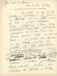 FARRÈRE ClaudeManuscrit autographe signé, intitulé « Un Sujet de Roman, par Sacha Guitry ». [Janvier 1923] ; 22 pages in-4°. Bel article de critique dramatique sur la pièce de Sacha Guitry, Un sujet de roman (créée au Théâtre Édouard VII le 4 janvier 1923). « Le public de M. Sacha Guitry a accoutumé de venir au théâtre Édouard VII pour y rire à gorge déployée. Hier, confiant dans son habitude acquise, il riait comme à l’ordinaire. Mais peut-être avait-il tort... [...] La nouvelle pièce de M. Sacha Guitry, réputé l’amuseur de Paris, est une pièce pleine de vérités très rares […] L’auteur du Blanc et du Noir, qui venait de commettre une façon de vaudeville, a jugé qu’il se devait de commettre, immédiatement après, une manière de tragédie. Et cette tragédie m’a bien l’air d’être un chef-d’œuvre. » Farrère décrit l’intrigue dramatique, rapporte quelques répliques frappantes, et conclut sur l’interprétation de « la plus belle pièce, à mon goût, de toute l’œuvre de Sacha Guitry, parce que la plus cruellement inhumaine » : « M. Levaillé, c’est Lucien Guitry, celui qui n’a pas besoin de texte. [...] Tout ce qu’avait créé Sacha, Lucien l’a multiplié. Et il semble, en vérité, qu’un seul cerveau, celui du père et celui du fils, ait mis debout ce résultat superbe. »