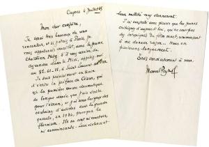 PAGNOL MarcelLettre autographe signée, adressée à Alain Virmaux. Cagnes, 4 juillet 1965 ; 1 page 1/2 in-4°. Intéressante lettre sur César.« Je serai très heureux de vous rencontrer, et si j’étais à Paris, je vous appellerais aussitôt, avec le jeune Christian Metz. S’il vous arrive de descendre dans le Midi, appelez moi au 82-61-15, à Saint Laurent du Var. Je suis précisément en train d’écrire la préface de César, qui est la première œuvre dramatique de longue durée que j’ai écrite pour l’écran, et j’ai sous les yeux des centaines d’articles dont la grande querelle, en 1934, provoqua la floraison. Ils ne sont ni courtois, ni convaincants. Leur violence et leur nullité vous étonneront. J’ai constaté avec plaisir que les jeunes critiques d’aujourd’hui, qui ne sont pas des intoxiqués du film muet, commencent à me donner raison ».