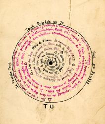 TARNAUD ClaudeManuscrit autographe. [Circa 1948] ; 1 page in-8°. Manuscrit autographe en 2 couleurs, rose et noir formant rosace dans un cadran avec au dos un autre manuscrit autographe, figurant le plan d’un texte. Cette rosace constitue ce que Claude Tarnaud appelait un « poème à occultation progressive ». Il s’agit selon toute apparence du premier jet du poème paru dans le n° 4 de la revue Néon, en janvier 1948 (page 3).