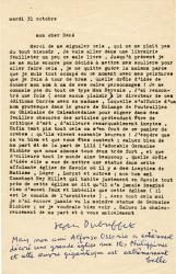 DUBUFFET JeanLettre signée avec 3 lignes autographes. mardi 31 octobre [1950], adressée à son cher René [de Solier] ; 1 page in-8 dactylographiée. Trop « occupé en ce moment avec mes peintures que je fais à tour de bras », Dubuffet n'a pas encore pu aller en librairie « feuilleter un peu ce sale livre [Les dieux ne nous aiment pas de Max Servais] [ ] Quelle drôle d'idée de donner mon nom à l'un de ses sales personnages ! ». Il ne connait pas Max Servais mais a déjà rencontré le directeur des éditions Corréa et sa femme qui « s'affuble d'un nom grotesque dans le genre de Solange de Poutrailles et Ghislaine de Calembredaine pour signer dans des feuilles obscures des articles prétendant être de critique d'art, d'ailleurs remarquablement ineptes. Enfin tant pis tout cela on s'en fout : qu'ils vivent heureux ensemble ! » Il prie de saluer de sa part « l'adorable Germaine Richier que nous aimons tous deux très fort, et que d'ailleurs tout le monde aime beaucoup. Quelle drôle d'idée elle a eue de mettre une statue dans cette affolante église de Savoie [Notre-Dame-de-Toute-Grâce sur le plateau d'Assy] où il y a des inepties de Matisse, Léger, Lurçat et les autres ». Il n'a jamais vu de statue de Germaine Richier et aimerait bien en voir une. Son ami Constant Rey Millet n'a jamais rien vu d'aussi « faux et imbécile que cette église ». Il ajoute de sa main que son ami « Afonso Ossorio a entièrement décoré une grande église aux îles Philippines et cette uvre gigantesque est extrêmement belle ».