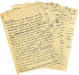 CHAISSAC GastonPièce autographe signée, écrite au dos d’une enveloppe, adressée à Pierre Giraud. 9 juin 1948 ; 1 page in-12, adresse timbrée sur le verso.« Cher P.G. De toi je crois que c’est mon évêque ébauchant le geste de la bénédiction des blés que j’aime le plus. Et je t’expliquerai pourquoi quand on se verra. J’ai dessiné hier sur la muraille un gros ventru qui porte un seau et qui est peut être plus trapu que ventru. Je pourrai fort bien exposer des choses à Limoges si ça se trouve. Amitiés. G. Chaissac. »On joint la lettre de son épouse qui était à l’intérieur: grande lettre autographe signée de Camille Chaissac. Cette très intéressante lettre, longue de 4 pages in-folio (31 x 19 cm) foisonne de renseignements sur la vie du couple Chaissac. « Gaston, lui, a l’air d’oeuvrer beaucoup plus au hasard, gratuitement, , il y a des réussites, mais ça m’a toujours gêné de ne pas le voir plus “engagé”. Il est absorbé, concentré bien sûr, mais tout lui ne participe pas au mieux. Son corps n’est là que pour sécréter des toxines qui changent sa vision du monde mais pas la réalisation de l’épanouissement ; et la volonté absente qui doit décider, comparer, choisir ce qu’il convient présentement d’exprimer étant donné les matériaux, la couleur du ciel, l’humeur, l’inspiration etc. Il a bien le désir de créer du beau, de l’harmonieux, du personnel, mais aussi de l’original, du jamais fait non parce que c’est mieux, mais parce qu’il croit être le premier à y penser. »