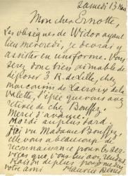 DENIS MauriceLettre autographe signée adressée à Mr Ernotte. Saint Germain en Laye, Samedi 13 Mars 1937 ; 1 page in-8°, au dos adresse et cachets postal. Lettre parlant des obsèques de Widor Charles-Marie compositeur. « Les obsèques de Widor ayant lieu mercredi, je devrai y assister en uniforme. Vous serez donc bien aimable de déposer 3 R.de Lille, chez mon cousin de Lacroix de la Valette, l’épée que vous avez retirée de chez Bouffez. Merci d’avance. mardi au plus tard. J’ai vu Mme Bouffez, elle vous a beaucoup de reconnaissance pour les services que vous lui avez rendus. raison de plus pour me dire votre ami ».