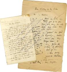 QUINET EdgarEnsemble de 3 manuscrits autographes (dont un signé et un incomplet), d’adresses aux électeurs. 9 pages in-folio in-8° (un feuillet effrangé).Belles proclamations républicaines. — Paris, 6 mai 1849, à ses concitoyens : « Voulez-vous rendre impossible le retour des Révolutions ? Confondez le salut de la République avec le salut même de la Patrie. […] La France a enfanté avec douleur la République. Mais la mère étouffe-t-elle son enfant à cause du travail qu’il lui a causé ? Ses douleurs mêmes lui sont une raison nouvelle de s’attacher au fruit de ses entrailles. »— [Vers 1870], aux électeurs de la Seine : « Il y a quarante ans quand nous affirmions la République, combien étions-nous ? Chaque année, la France est venue à nous. Qu’ont pu, contre nous, les interdictions, les proscriptions, les exils ? Ils n’ont servi qu’à augmenter notre nombre […] La République vit et elle vivra. »— [1871 ?], aux électeurs républicains de la Haute-Garonne. Se peut-il « que quelques Républicains se disposent à s’abstenir, ou […] à perdre leur vote sur un autre nom, que celui de Mr de Rémusat ? S’il en est ainsi, qu’ils me permettent de les adjurer de renoncer à une pensée si funeste à leur propre cause. »
