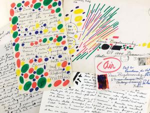 REICHMAN FredEnsemble de 4 documents [adressés à Daria Bogdanovsky en France]. Lettre autographe signée. San Francisco, 23 juin 1960 ; 2 pages in-4°, en français. Il donne de ses nouvelles, « C'est beaucoup de temps depuis j'ai essai à écrire en français [ ] Je suis un père maintenant, a belle fille de 14 mois s'appelle alexandra ! Ma femme Michela et moi nous sommes très heureux avec le soleil qui se leve chaque jour dan sa rire sa joie de vivre ». Il prépare une exposition au musée de la Légion d'Honneur, qui après partira à Los Angeles à sa galerie : « J'ai fait beaucoup de progrès depuis vous avez vu mes tableaux à Paris. Plus de la nature et plus de les choses qui sont très proches même dedans mon coeur » (il a illustré sa lettre de points géométriques, ce qui la rend artistique). Lettre autographe signée. San Francisco 17 février [1964] ; 1 page grand in-8 oblongue, en français, illustrée d'une composition imprimée, grande enveloppe jointe. De retour chez lui après son séjour parisien, il lui a été difficile à se remettre au travail, mais il s'y est bien lancé et prépare sa prochaine exposition. « Sur notre retour chez nous, il était très très difficile à commencer notre rhythme comme l'autre foie. Et, j'ai trouvé qu'il était très très difficile à peindre ! Quel surprise ! Mais, depuis un ou deux mois, j'ai commencé à travailler avec esprit et le travail est maintenant bien ! Nous sommes très contents maintenant » Lettre autographe signée. San Francisco, 25 mars 1966 ; 1 page grand in-8, en français, enveloppe jointe enrichie au dos de dessins de sa fille Alexandra (6 ans 1/2). La lettre est illustrée de points et taches de couleurs, ce qui la rend très attrayante. Il annonce sa venue en France. « Nous irons en france cet été et nous espérons être à Paris pour 15-21 jours entre le 15 juin et ? juillet. Serez-vous à Paris ? Connaissez vous d'une endroit où nous pourrons demeurer ? » Copie d'un article sur lui paru en octobre 1965 en anglais, sur lequel il a ajouté une correspondance autographe signée (7 lignes, 1 page in-4, en français), enveloppe jointe enrichie de dessins aux feutres de couleurs. « Ca va bien ici, je travail, je fait des tableaux et je suis en train de faire quelque progrès. Les enfants sont un joie pour ma femme et moi, même si c'est beaucoup de travail. » L'ensemble est très attrayant.