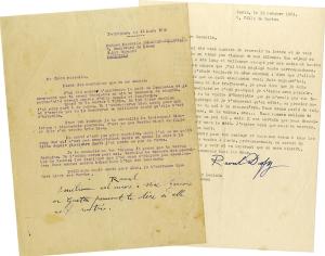 DUFY Raoul2 lettres signées (la première avec 3 lignes autographes), adressées à son amie Marcelle Laclais à Marseille. 1948-1951 ; 2 pages in-4 dactylographiées.— Perpignan 15 mars 1948. Nouvelles de leurs amis et condoléances… « Pour ton lumbago je te conseille le traitement électrique : diathermie profonde. C’est ce que Berthe vient de faire et elle s’en trouve très bien. Il va mieux mais a eu un coup dur, et comme je suis à la diète […] j’ai perdu un peu de forces ».— Paris 19 octobre 1951. Il revient d’un long séjour en Amérique, « tellement occupé par les soins et toutes les autres choses que j’ai bien négligé toute correspondance. Et puis, c’était toujours la même chanson : dire que j’allais mieux sans que ce soit absolument vrai. Mais aujourd’hui, après ce long et dur traitement, je peux dire que je suis vraiment amélioré ». Ils descendront bientôt dans le Midi et espèrent l’y voir. Il la félicite pour son mariage et leur envoie « tous nos vœux à tous les deux ».