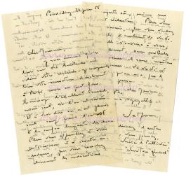 BERL EmmanuelEnsemble de 4 lettres autographes signées, adressées à Suzanne Muzard. [vers 1927-1953] ; 20 pages in-4°. Belle correspondance. « Je pense que personne n’est aussi fondamentalement bonne, pure, & désintéressée que toi. Tes admirables qualités te viennent de toi. Tes défauts t’ont été donnés par la vie : misère de l’enfance, déceptions de l’adolescence, difficultés & luttes de la maturité. [...] ton goût de l’Absolu est ce qui, en toi m’attire le plus. Il était chez maman. [...] Je souhaite un enfant de toi, non pour te retenir - mais pour t accomplir. Et moi-même […]- S’il est un de mes actes que je ne regrette pas, c’est mon mariage avec Suzanne Muzard ». Rare.