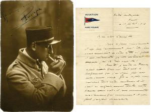 POURPE MarcExtraordinaire et rare dossier sur ce grand pilote.— Journal Excelsior, édition du mercredi 28 janvier 1914 concernant l’exploit de Marc Pourpe en reliant Le Caire à Khartoum.— 2 cartes postales le représentant ou il a obtenu le recordman de la traversée de la Manche, Boulogne à Folkestone aller et retour.— Photographie le représentant distribuant quelques plis emportés lors de son vol Le Caire Khartoum (retirage).— Photographie dédicacée. 10,5 x 7 cm. — Photographie le représentant au milieu de ses camarades, signée au dos (Escadrille S.A.4.18 - Secteur postal 180). 7 x 10 cm.— Lettre autographe signée, adressée à son cousin Camille Pourpe. Hanoï 10 juillet 1913 ; 2 pages in-4°. « Deux lignes simplement et un peu tardivement peut-être pour vous remercier de votre lettre si gentille et des sentiments qu’elle contenait auxquels j’ai été très sensible. Bientôt je rentre en France après avoir terminé tout seul le programme que je m’étais fixé avec mon pauvre vieux Geo. Enfin nous suivons tous notre destinée, et il faut se résigner ; aussi triste notre pauvre coeur soit-il aux événements malheureux qui surviennent et nous font parfois chanceler. Ici, encore, bien plus qu’ailleurs, ma chance et ma réussite a été complète, je rentre le coeur gros de laisser mon ami derrière, mais néanmoins très fiers des résultats que nous avons obtenus »...