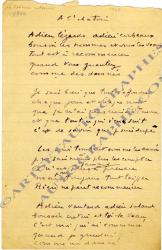 SOUPAULT PhilippePoème autographe « À l’abattoir », publié dans Poèmes retrouvés (1918-1981), Éditions Lachenal et Ritter, 1982.[Daté au dos 1950] ; 1 page in-8°. 4 quintils, avec quelques corrections.Magnifique poème. « Adieu lézards adieu corbeauxBonsoir les hommes et vous les veauxTout est à recommencerQuand vous gueulezComme des damnésJe sais bien que tout s’effondreChaque jour et chaque nuitQue je n’ai plus rien à attendreEt que tout ce qui s’ensuitC’est de savoir que je suis dupeLes soirs tombent comme les annéesJe ne sais même plus les compterCe n’est plus jamais à prendreMais pour toujours tout laisserRien ne peut recommencerAdieu vantard adieu salaudBonsoir crétin et toi le veauC’est moi qui ai commencéQuand je gueulaisComme un damné. »