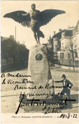 SANTOS-DUMONT AlbertoPièce autographe signée. 14 août 1922 ; 1 page in-16, petit trou d’épingle dans le haut. Sur carte postale représentant le monument Santos-Dumont à Saint-Cloud sur lequel s’appuie Santos-Dumont. « À Madame la Vicomtesse Bernard de Bonneval, hommage de Santos-Dumont. “Lutetia”, 14-8-22 ». Autographe rare.La fin du XIXe siècle voit se multiplier de nombreuses tentatives pour conquérir les airs. Les coteaux de Saint-Cloud sont tout naturellement sélectionnés pour tester les premiers essais d’aéronefs à moteur et pour voir s’élever les ballons sphériques. Le 19 octobre 1901, le Brésilien Santos-Dumont, un des pionniers de l’aviation, réussit l’exploit d’utiliser pour la première fois un moteur à explosion en aéronautique. Il parvient, sur son dirigeable numéro six, à faire l’aller-retour entre le parc de l’aéro-club de France de Saint-Cloud et la tour Eiffel en moins de trente minutes. Une statue en bronze, symbolisant Icare, en hommage au premier homme qui tenta l’aventure aérienne, est érigée à cette occasion sur le terrain. Pendant la Seconde Guerre mondiale, celle-ci est fondue par les Allemands. La paix survenue, le gouvernement brésilien ouvre une souscription qui permet d’offrir à la France une réplique de la statue détruite. Elle est inaugurée le 4 juillet 1952.