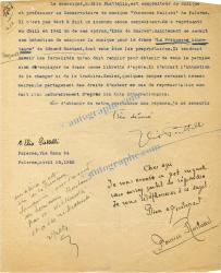 ROSTAND MauricePièce signée d’Elio Piattelli, avec 5 lignes autographes signées de Maurice Rostand. Palerme, 25 avril 1945 ; 1/2 page in-4°. « Le soussigné, M. Elio Piattelli, est compositeur de musique et professeur au conservatoire de musique “Vincenzo Bellini” de Palerme. Il n’est pas tout à fait inconnu comme compositeur. On a représenté au Chili en 1941 un de ses opéras, Inès de Suarez. Maintenant ce serait son intention de composer la musique pour le drame La Princesse lointaine de Maurice Rostand dont vous êtes les propriétaires. Il voudrait savoir les formalités qu’on doit remplir pour obtenir de vous la permission d’employer ce drame comme libretto d’opéra. » Maurice Rostand renvoie ce document à la Société des auteurs compositeurs pour qu’elle lui réponde. Il semble qu’un refus lui a été opposé.