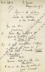 LOWINSKI AlbertLettre autographe signée, adressée à M. Auguste Jullien. San date ; 2 pages in-12. « Je suis venu vous voir, vous remercier et vous prier d’accepter un modeste dîner d’artiste si vous rentrez avant le 6 et que vous soyez libre. Venez me joindre à 6 heures précises au palais royal ».