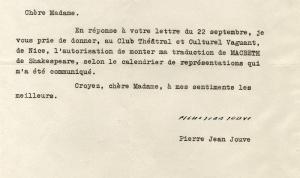 JOUVE Pierre-JeanLettre signée, adressée à Mme S. Arnoux. Paris, 26 septembre 1966 ; 1/2 page in-4°. « Je vous prie de donner au Club Théâtral et Culturel Vaguant de Nice, l’autorisation de monter ma traduction de Macbeth de Shakespeare, selon le calendrier de représentations qui m’a été communiqué. »