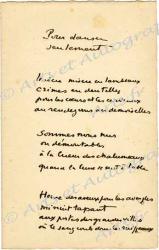 SOUPAULT PhilippePoème autographe signé « Pour danser seulement ». [1946] ; 1 page 1/2 in-8°. Publié par l’éditeur Eynard (Suisse), en 1949, dans un recueil intitulé Chansons.« Pour danser seulementMisere misere en lambeauxcrimes en dentellespour les cœurs et les cerveauxau rendez-vous des demoisellesSommes-nous nusou démontablesà la lueur des chalumeauxquand la lune se met à tableHeure des aveux pour les aveuglesminuit tapantaux portes des grandes villesoù le sang coule dans les ruisseauxSauvez la face sauvez le feuvolez au secours des oiseauxnous retrouverons les hirondellesles libellules les demoisellesPhilippe Soupault. »Tirée de Trois chansons du jour et de la nuit (1946).