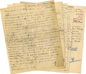 LIMBOUR GeorgesEnsemble de 8 lettres autographes signées, adressées à Armand Salacrou. Sans date ; 19 pages in-4°, quelques pages effrangées en bordure. Très intéressante correspondance entre les deux écrivains.— « Je ne regrette pas Paris, bien que ce soit là que la civilisation règne en dominatrice avec ses mille artifices, et où sont mes amis qui sont ce que les civilisations ont fabriqué de mieux, c’est Wiesbaden avec son petit tramway jaune qui vient du Rhin et l’air de musique au fond des vallées qui fait danser, c’est l’odeur des tilleuls sur les routes l’été , et le chant des crapauds de Schierstein, c’est avec le plus amer désespoir et une nostalgie telle que j’écrirais bien une lettre à M. Le directeur de l’Echo du Rhin afin qu’il me fasse revenir, le grand pont rouge qui à Mayence traverse le Rhin. Ce sont les allemandes mélomanes et les gros buveurs de bière au fond des cafés ouverts après une cour et une autre encore, au fond des maisons. Ce sont les pâtisseries de là bas, ce sont les eaux magnifiques et le vin du Rhin, le Rhin, le Rhin, celui qui a tenu dans mon verre, ce sont les cerises et les bains miraculeux, les Russes, un air d’ennui et six mois de volupté. Mais quel malheur que tu n’aies pas connu les petites villes de l’Italie du Sud, les petits ports où j’ai passé des journées précieuses. Le charme de ce voyage est à siècles derrière moi, maintenant, par delà l’Adriatique qui est une rivière, mais par delà les montagnes d’Albanie que Titan ne soulèverait pas. Les bateaux ont peur d’aborder à ce pays. Aussi descendu de ma barque, c’est ainsi que j’atteignis la terre albanaise. Une dizaine de sauvages m’attendaient sur le bord. Ils étaient couverts de haillons ...»— « J’irai à Paris le 19 qui est dimanche et par conséquent je pense que le grand maître jouira de son jour de repos hebdomadaire. Je n’aime pas les villes le dimanche (encore moins la campagne), mais il faut bien passer qq. part. Aussi habillez vous comme en semaine et ne mettez pas de chemise propre. […] J’ai eu un nouveau furoncle composé divisé en plusieurs salles et vestibules comme un temple égyptien ».