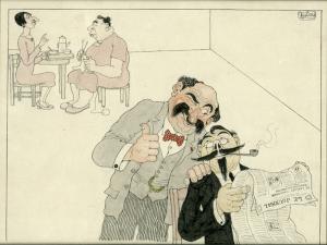 DUBOUT AlbertAquarelle originale signée. 195 X 150 mm. Aquarelle à l’encre de Chine et couleurs. Les gouvernements : « Hein, vieux ! nos gouvernements à nous ... Ils tiennent plus longtemps !.... » Encadrée.