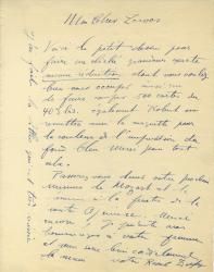 DUFY RaoulLettre autographe signée, adressée à Christian Zervos. 1 page in-4°. Il annonce l’envoi d’un petit dessin « pour faire un cliché grandeur exacte aucune réduction. […] Robert vous remettra aussi la maquette pour la couleur de l’impression du fond bleu. Merci pour tout cela. Passerez-vous dans votre prochain numéro le Mozart et la Femme à la fenêtre de la vente Quinn ?».