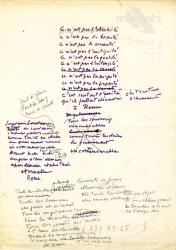 SOUPAULT PhilippePoème autographe avec nombreuses ratures. Sans date ; 1 page in-4°, à l’encre et au crayon. Il s’agit très certainement du premier jet du poème « Ode à Rome ».On joint la plaquette de l’édition de ce poème : « Ode à Rome », poème de Philippe Soupault, eaux-fortes de Sergio Ceccotti et Georges de Canino. Texte de Jean Leymarie. (numérotées et signées). Éditions Matarasso. Nice, 1983 ; 250 x 350 mm, petits accrocs en bas de la couverture du recueil imprimé. Tirage à 70 épreuves.« Ce n’est pas la beautéCe n’est pas la cruautéCe n’est pas l’antiquitéCe n’est pas la qualitéCe n’est pas l’intensitéCe n’est pas la majestéCe n’est pas la papautéC’est surtout l’amitiéC’est surtout l’humanitéqu’il fallait découvrirà Rome. »