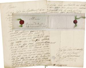 SAINT-SIMON Claude de Rouvroy, comte de Rasse puis duc deLettre autographe signée, adressée à son père Monsieur de Rasse, bailli et gouverneur de Senlis. A Saint-Germain, ce 18 janvier 1633 ; 2 pages in-8°, adresse avec fermeture de fils de soies vertes sous cachets de cire rouge. Cette lettre illustre en plein les pages des mémoires de Saint-Simon, relatives à son père. C'était l'époque relatée par Saint-Simon, dans ses mémoires, où Claude de Saint-Simon allait vendre sa charge de premier gentilhomme de la Chambre du roi, pour acheter de son frès ainé la terre de Saiont-Simon qu'il fit ensuite ériger en duché-pairie. Il faillut tomber en disgrâce pour avoir demandé avec trop de chaleur la grâce du duc de Montmorency , décapité à Toulouse le 30 octobre 1632. C'est sans doute à ces événements qu'il fait allusion dans sa lettre : « il est vrai que j'ai été dans des douleurs extremes en ce dernier rencontre mais dieu mercy la promotion des chevaliers a été remise jusque a la Pentecoste... » Le roi de la meilleure grâce du monde lui a permis de tirer récompense de sa charge de gentilhomme de sa chambre. Il en a une grande joie, car cela vaut 100 000 livres qu'il emploiera comme cela sera agréable à son père. Il recommande à ce dernier de soigner sa santé. Son frère et son oncle Desche iront le voir un de ces jours.