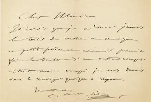 SAINT-SAËNS Camille3 lettres autographes signées, adressées [au poète Édouard Guinand]. 1880 et sans date ; 5 pages 1/2 in-8° et 1 page oblongue in-4°. 2 avril 1880 : « Je serai probablement obligé de faire quelques coupures dans L'Orage, je pense que vous me le permettrez. » Aix-les-Bains, 3 juillet 1880 : « Je n'ai pu encore songer à me mettre à l'ouvrage pour Le Retour. Rien ne presse du reste et je suis forcé de m'occuper avant des choses que je compte faire exécuter au commencement de l'hiver. Le Retour est vraisemblablement la tâche du mois de novembre, et je ne montrerai cette uvre à personne avant qu'elle ne soit complètement terminée, ainsi que j'ai toujours fait ». Il le consultera cependant « pour quelques coupures qui me paraissent indispensables, les concerts de M. Guillot de St Bris ne comportant pas d'uvres de trop grandes dimensions ». Il annonce qu'il ne pourra pas mettre le petit poème en musique, qu'il renvoie pour « faire le bonheur d'un autre compositeur moins occupé ».