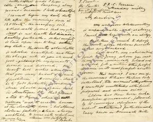 PROUT SamuelLettre autographe signée « S. Prout », adressée à M. J. Henderson. Sans date ; 4 pages in-8°, en anglais, traduction tapuscrite jointe. Prout se lamente de la mort d’un ami. « My aversion to letter-writing is unpardonable — and as always —. I must begin with an apology. […] Last week my valued medical friend Doc. Young, whom you met in my room — universally beloved and respected, fell victim to this fearful epidemic in its most fearful asiatic form. This morn’g I was one of the mourners to have the poor body in the tomb, ‘til we meet at the fathering of countless multitudes at the final judgment and solemn crisis. Seldom has there been such a procession of mourners followed by 15 carriages of the respect entertained for the deceased. Every house on Denmark Hill and every shop in the village was closed […] This is a sad gap in our little circle. He had collected with good taste, an extensive number of most valuable draw’gs by the old masters, also rare prints — pictures, bronzes, etc. […] Like yourself he collected treasures of art, with the desire and always ready to contribute to the enjoyment of others […]. Your new Guardi I have not see, and woe is me that a dog at my heels has prevented my seeing your valuables. I may only dream the enjoyment you offer, and indulge imagination. »