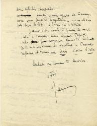 RAIMU (Jules Muraire, dit)Lettre autographe signée, adressée à Henri Alibert. Bandol, dimanche ; 2 pages in-4°. Les lettres de Raimu sont rares.« Mon cher Alibert. Ce mot que j’espère tu vas recevoir avant ton départ. Après mure réflexion, Marius va te faire faire de très gros frais.1° Il faut que tu redemande le décor à Volterra car le tiens pouvais servir pour Fanny Mais il est impossible pour Marius. Il n’est pas à l’échelle, il faudrait en refaire la moitié, il faut faire des portes en bois et dans ce décor en toile légère elles ne tiendront pas. La porte est trop grande, il faut la refaire en entier - il n’y a pas de fermeture en dehors. De plus, jamais Demazis en admettant qu’elle veuille bien jouer César et pas Marius pour un un mois de répétitions, elle va te demander un gros cachet. Et ça il faut un mois de répétition avec tous les artistes, c’est une création donc réfléchi à tout cela. Tandis qu’une reprise de Fanny avec une semaine de répétition nous étions prêts et pas de décor à louer ou à refaire. J’aurais bien voulu te parler de tout cela comme à Cannes, mais devant Pagnol cela aurait pu démolir la suite. Si tu n’as pas donné la signature à Pascal réfléchis et trouve un biais biaise biaise.Hubert me donnera ta décision. A toi, Raimu. »