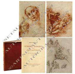 BOYLESVE René — Tigrane Polat« NYMPHES DANSANT AVEC DES SATYRES ». Ouvrage illustré de 20 eaux fortes originales de T. Polat. Les Éditions d’art Devambez, Paris, 1930. Un des 151 exemplaires, imprimé spécialement pour la Société nouvelle des Éditions d’art Devambez. Reliure en plein maroquin rouge sombre de Gruel. Reliés au début, trois grands dessins originaux de Tigrane Polat à la sanguine, signés. Il est joint une carte postale autographe signée de René Boylesve (1910). Dos légèrement passé, sinon très bel exemplaire.