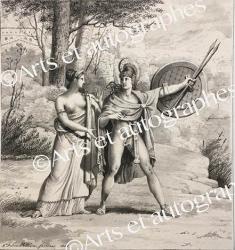 PALLIÈRE Armand JulienDessin à la mine de plomb. 16,5 x 15 cm.Signé et daté 1808, à l’encre, en bas à gauche.Scène montrant le dieu de la guerre de la mythologie grecque, Arès, avec une jeune femme.
