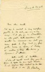BERLIOZ HectorLettre autographe signée, adressée à Camille Pal, mari de Nancy Berlioz. Dimanche 20 avril [1851] ; 1 page in-8°. « J’ai reçu le mandat de cinq cent francs payable le 30 avril, que vous m’avez envoyé. C’est plus que de l’exactitude de votre part. Mille remerciemens. Le Ministre du Commerce ne sait pas encore que le Jury dont je fais partie devra se rendre à Londres ni combien de temps il devra y séjourner. J’attends. Mille amitiés à Mathilde. Louis est reparti avant hier pour le Hâvre, il reprend la mer après demain. Il est toujours content de son état. Tout à vous, H. Berlioz. »Avril 1851 : Berlioz est invité par le Ministre du Commerce à faire partie d’un jury international pour adjuger les instruments de musique exposés à l’Exposition Universelle à Londres.