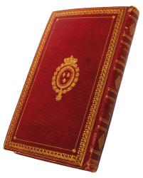 POSTES ROYALES.« ÉTAT GÉNÉRAL DES POSTES DU ROYAUME DE FRANCE », suivi de la carte géométrique des routes desservies en poste, avec désignation des relais et distances, pour l’an 1820. Paris, Imprimerie Royale, 1820 ; in-8°. Très belle reliure plein maroquin rouge à grains longs, plats aux armes royales entourées d’une roulette de frises dorées, roulette intérieure, garde de moire bleue, tranches dorées. Ex-libris en lettres dorées avec armoiries sur fond rouge de La Bédoyère. Époque Restauration. Ouvrage bien complet de la grande carte dépliante aquarellée. Très bel exemplaire en maroquin rouge de l’époque aux armes de Louis XVIII.