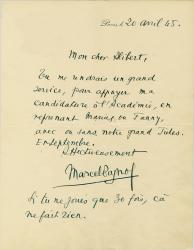 PAGNOL MarcelLettre autographe signée, adressée à Henri Alibert. 20 avril 1945 ; 1 page in-4°. « Mon cher Alibert, Tu me rendrais un grand service, pour appuyer ma candidature à l’Académie, en reprenant Marius ou Fanny, avec ou sans notre grand Jules. En septembre.AffectueusementMarcel PagnolSi tu ne joues que 30 fois, çà ne fait rien. »