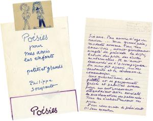 SOUPAULT Philippe[Poésies pour mes amis les enfants]. 7 manuscrits autographes dont trois signés, [1976-1982] ; 8 pages formats divers. Bel ensemble de textes et poèmes du recueil Poésies pour mes amis les enfants (Lachenal & Ritter, 1983). — Page de titre autographe calligraphiée au feutre bleu, avec un petit dessin d’enfant collé. — Texte de la préface : Six ans. Pas encore l’âge de raison ... Soupault évoque une distribution des prix présidée par son grand-père, où les écoliers chantaient une comptine. « C’est ce souvenir qui m a incité à écrire quelques poèmes pour mes amies et mes amis des écoles, des lycées, des grandes écoles et des maisons de retraite ». — Poème La petite EmmanuelleVive comme une hirondellerépond au téléphonequand on sonneElle ne joue pas au ballonmais aux bulles de savonsans ruse et sans malicecomme sa grande soeur Alice.— Poème Véronique est maladetrop de marmelade...— Poème C’est demain DimancheIl faut apprendre à souriremême quand le temps est grisPourquoi pleurer aujourd’huiquand le soleil brilleC’est demain la fête des amisdes grenouilles et des oiseauxdes champignons des escargotsn’oublions pas les insectesles mouches et les coccinellesEt tout à l’heure à midiJ’attendrai l’arc-en-cielviolet indigo bleu vertjaune orange et rougeet nous jouerons à la marelle.— Poème Qui frappe à la porte...— Poème Bastien mon amioù sont tes bottes...