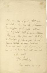 BERLIOZ HectorLettre autographe signée adressée à Ernest Legouvé. Jeudi matin 19 décembre [1838] ; 1 page in-8°, adresse au verso du second feuillet. À propos de l’aide financière que vient de lui apporter Paganini. « Oui, mon cher Legouvé, tout cela est vrai ; mais vous êtes l’homme du monde que la noble action de Paganini doit le moins étonner. Remerciez-bien pour moi Mme Legouvé de l’intérêt qu’elle a pris à cet heureux incident de mon roman »… Berlioz avait donné au Conservatoire, le 16 décembre 1838, un concert auquel assista Niccolò Paganini. Après avoir entendu Harold en Italie, le violoniste adressa une lettre louangeuse au compositeur, avec un reçu pour toucher la somme de 20 000 francs. Ce don, important, provoqua toutes sortes de remous et de commentaires dans le milieu artistique. Quant à Ernest Legouvé, qui avait également aidé financièrement son ami - à une moindre hauteur - il se vit dédier l’ouverture de Benvenuto Cellini en janvier 1839.