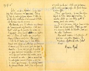 RAVEL MauriceLettre autographe signée, adressée à sa marraine de guerre, Mme Fernand Dreyfus (la mère de Roland-Manuel). 23 juillet 1916 ; 2 pages in-8° avec enveloppe jointe (cachet des Convois automobiles). Il s’est trop hâté d’annoncer sa permission car il n’y a toujours rien de nouveau. Sa demande lui a été retournée pour renseignements supplémentaires, et son lieutenant actuel l’a renvoyée lui-même en l’appuyant. « Je ne suis pas prêt de quitter ce pays verdoyant et paisible : on s’est avisé que mon radiateur était moche […] et j’en ai encore pour longtemps. Ce radiateur couvert de glorieuses blessures, dont j’étais si fier — il n’y avait pas de quoi : c’était mon prédécesseur qui les avait reçues, mais enfin cela faisait toujours le même effet. » Belle et longue lettre.