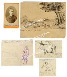SÉRUSIER PaulDessin dédicacé et signé. Sans date ; 150 x 190 mm. Dessin à l’encre représentant un pâtre surveillant des porcs dans un paysage de montagne. Sous un arbre, le jeune pâtre joue de la clarinette envoi : « Bucolique à mon ami Jules Riottot. » « La modestie m’empêche de signer. P. Sérusier ».On joint 3 dessins représentant son professeur d’histoire caricaturé en cochon, en taureau et en maillot au bord d’une piscine ainsi qu’une photographie le représentant jeune, vers 1882.Cet ensemble provient d’un ami d’enfance de Paul Sérusier, Jules Riottot.