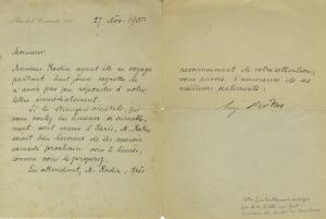 RODIN AugusteLettre signée. Paris, le 27 novembre 1905 ; 1 page 1/2 in-8°, fente, aux plis et fort pli sur la signature, sur papier à en-tête du 182 rue de l’Université. « Monsieur Rodin ayant été en voyage pendant huit jours regrette de n’avoir pas pu répondre à votre lettre immédiatement. Si les étrangers orientals, qui vous voulez lui amener si aimablement sont encore à Paris, M. Rodin serait bien heureux de les recevoir samedi prochain vers 2 heures comme vous le proposez. En attendant, M. Rodin, très reconnaissant de votre attention vous envoie l’assurance de ses meilleurs sentiments. » Lettre probablement rédigée par R.M. Rilke qui fut secrétaire de Rodin en 1905/1906.