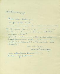 DEBUSSY ClaudeLettre autographe signée adressée à Mr Salomon Joseph violoncelliste et ami de Claude Debussy. 24 mars 1917, 1 page in-8°. Quelques jours auparavant, Salmon et Debussy avait joué ensemble lors d'un concert uniquement consacré aux oeuvres du compositeur donné le même jour au profit de L’Œuvre du Vêtement du blessé, 4 avenue Hoche. « Encore merci pour ton concours amical. Au surplus, je crois que nous avons fait une bonne action. C’est bien quelque chose ? Quand viendrez vous, toi et ta pipe l’un fumant l’autre, embaumé mon cabinet de travail ? Tu me dois une histoire ! Ton viel ami, Claude Debussy »