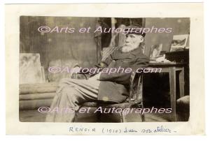 RENOIR AugustePhotographie en tirage ancien. [1910] ; 170 x 105 mm, collée sur un carton. Belle photographie représentant Auguste Renoir assis dans son atelier vers 1910.