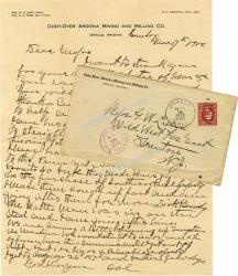 BUFFALO BILL (William Frederick Cody, dit)Lettre autographe, signée « Col [onel]», adressée au major G.W Lillie. Oracle, Arizona, 17 mars 1912 ; 1 page in-4° avec en-tête « Cody-Dyer Arizona Mining and Milling Co », enveloppe jointe. Sur une question de propriété douteuse. « I want to thank you for your splendid letter of Mar 3rd. You are a wonder and you will allways [sic] have my thanks. And ernest [sic] endeavor to help and do my part. I am here at the mines trying to straighten out things. That these thieving Getchells got me so into. I may have to send young Getchell to the Penn yet… They made their big steal in the purchase of Southern Bell property. I made them cough up part and am going after them for more. Dick Brady the cattle man was in on the steal and I am going after him. We are mining a little opening up. We won’t attempt to have much expense here this summer until I get out of debt. But we have a valuable property. I get to Cody Wyo[ming] 26th and 27th and be there few days. » Lewis Getchell, habitant l’Arizona avait convaincu Cody et son homme d’affaires Daniel Burns Dyer d’investir dans une exploitation minière de la région. Cette lettre montre que Cody cherche à préserver sa réputation en montrant qu’il est propriétaire de son exploitation.