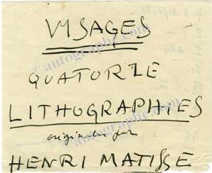 MATISSE Henri 亨利·马蒂斯Pièce autographe. Sans date ; 13,5 x 11 cm. Il s’agit d’une page-maquette pour l’ouvrage fait avec Pierre Reverdy. « Visages —quatorze lithographies originales par Henri Matisse. »Cette édition VISAGES, est parue en 1946 aux Éditions du Chêne avec quatorze lithographies de Henri Matisse, accompagnées de Poésies par Pierre Reverdy. C’est une très belle édition bien connue des bibliophiles.