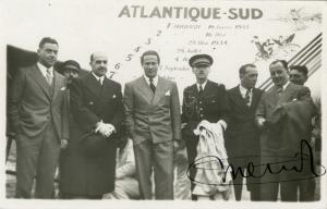 MERMOZ JeanPhotographie signée. 1934 ; 9 X 14 cm.Cliché pris devant l’Arc en ciel, avec son équipage (Domergue, Laverin, Giaroli et Claver). Cliché Keystone-France.Il est fait commandeur de la Légion d’honneur en 1934. Il disparaît en vol, aux commandes de la Croix du Sud, aux larges des côtes africaines, en 1936.