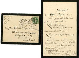 TWAIN Mark (Samuel Langhorne Clemens, dit)Lettre autographe, signée « SL Clemens », adressée au capitaine Richard Edgecumbe. [Weggis], 23 juillet 1897 ; 1 page in-8°, enveloppe timbrée avec adresse autographe jointe.Il lui envoie son adresse en Suisse. « Our house is very very small, but we think it will answer for two months. Where are you, now — in Switzerland ? »Twain et sa famille ont passé l’été 1897 en Suisse, séjour durant lequel il a commencé son œuvre Mysterious Stranger (non fini) et More Tramps Abroad, publié en 1898.