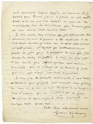 CHATEAUBRIAND François RenéLettre autographe signée. Genève, 22 juillet 1831. Formidable texte politique. Après avoir précisé quelques points dont le premier est qu’il n’est pas émigré, il écrit « Philippe d’Orléans n’est point mon Roi ; en vertu de ma souveraineté populaire, je ne lui ai point donné ma voix ; je l’ai donné tout haut, vous le savez encore à Henri V, tout simplement je ne veux pas revivre sous un prince dont je ne reconnais pas l’autorité. [...] Enfin la politique que l’on voit [détruire?] la France. Si la guerre survenait, je pourrais rentrer pour partager le sort de ma partie, mais je n’attend rien d’un gouvernement lâche et poltron qui livre l’Europe à nos ennemies. Quant à écrire j’ai besoin de repos [...] Peut-être irais-je le mois prochain en France vendre ma petite maison rue d’Enfer. »