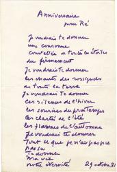 Poème autographe dédié à sa femme, intitulé « Anniversaire pour Ré »