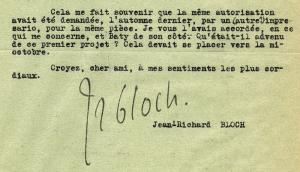 BLOCH Jean-RichardLettre signée, adressée à M. Alfred Bloch de la Société des auteurs et compositeurs. Poitiers, 4 mars 1932 ; 1 page in-4°. « Je vous donne bien volontiers l’autorisation que vous me demandez pour M. Mollet de donner une série de représentations de Karl et Anna les 9 et 10 avril prochain au théâtre des Beaux-Arts à Bruxelles. »