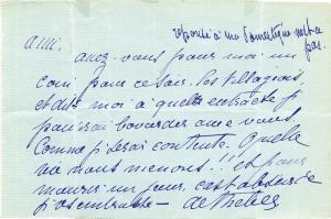 THÈBES Mme de (Anna Victorine Savigny, dite)Lettre autographe signée, adressée à Coquelin Cadet. Sans date ; 1 page in-12 oblongue.« Avez-vous pour moi un coin pour ce soir, Les Villageois, et dites-moi à quel entracte je pourrai bavarder avec vous. Comme je serai contente. Quelle vie nous menons !! et pour mourir un jour, c’est absurde. Je vous embrasse A. de Thèbes. »