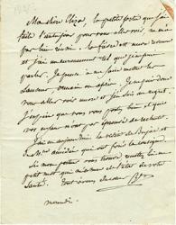 BÉRANGER Pierre-Jean deLettre autographe signée, adressée à Mme Fabreguettes. Sans date ; 1 page in-12. « Ma chère Elisa, la petite sortie que j'ai faite l'autre jour pour aller vous voir, ne m'a pas bien réussi. La fièvre est encore revenue et j'ai un enrouement tel que je ne puis parler. je pense à me faire mettre des sangsues, demain ou après. je ne puis donc aller vous voir ».