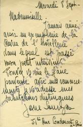SOURZA JaneLettre autographe signée, adressée à Paul Reboux. Paris, mercredi 8 septembre ; 1 page in-8°.« J’aurais aimé avoir un exemplaire de la Revue de l’hôtellerie dans lequel est passé mon petit interview. Pouvez vous me le faire parvenir ».
