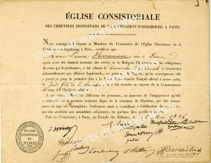 ÉGLISE CONSISTORIALE DE PARIS.Certificat de baptême imprimé à en-tête de l’Église consistoriale des chrétiens protestants de la confession d’Augsbourg à Paris. 12 mai 1836 ; 1 page in-4° oblongue. En faveur de Marie-Louise Heinemann, née à Paris qui « a été admise le dimanche 8 du courant à renouveler solennellement son alliance baptismale, en présence de l’église […] a été inscrite au registre de la communauté au rang des chrétiens adultes. Fait en Consistoire, à Paris, au temple des Billettes. » Nombreuses signatures.